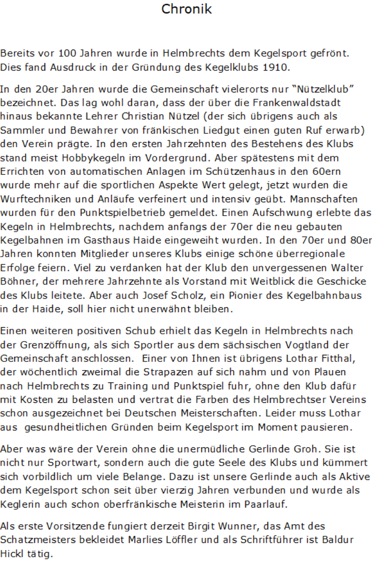Wir suchen Keglerinnen und Kegler „Alle Neune“ oder neun gute Gründe Mitglied in unserem Kegelklub zu werden 1.Kegeln ist in allen Bevölkerungsgruppen populär – ein echter Volkssport. Für Kinder, Frauen und Männer jeglichen Alters. Deshalb ist Kegeln ein idealer Sport für die ganze Familie.2.Der richtige Auflagepunkt, die richtige Kugelgeschwindigkeit. Beim Kegeln kommt es auf Präzision an. Und somit auf die richtige Technik, also auch auf eine gute Koordination. 3.Kegeln ist ein Ausdauersport. Je nach Disziplin wird über eine Distanz von von 100, 120 oder 200 Kugeln gespielt. Eine Trainingseinheit dauert über eine Stunde. Das hält fit. 4.Auch die Spannung bei Wettkämpfen sorgt für ein gutes Herz-Kreislauf-Training. Viele Punktspiele oder Einzelwettbewerbe werden erst mit den letzten Kugeln entschieden.5.Beim Kegeln wird nicht nur der ganze Körper trainiert. Wenn die Keglerinnen und Kegler 120 mal Anlauf nehmen, kommt der Geist nicht zu kurz. Circa 40 Minuten heißt es „Volle Konzentration“.6.Bei der schönsten Nebensache der Welt wird alles andere nebensächlich. Für viele Keglerinnen und Kegler steht fest: „Nirgendwo kann man sich besser vom Alltag abschalten, als auf der Kegelbahn“. 7.Einige spielen nur in der Mannschaft, andere nehmen nur an Einzelwettbewerben teil. Die meisten machen beides, weil Kegeln sowohl eine faszinierende Mannschafts- als auch Einzelsportart ist. 8.Immer besser werden. Wer will das nicht ? Das Schöne beim Kegelsport ist, dass die Zählgeräte auf den Trainingsbahnen die Ergebnisse, die Leistungsfortschritte von Breiten- bis Leistungssportlern auf den Punkt genau anzeigen.9.Kegeln ist eine Allwetter- und somit auch eine Ganzjahressportart. Kegeln eignet sich besonders auch für Sportler, die ihren Sport witterungsbedingt in der kalten Jahreszeit nicht ausüben können, aber fit bleiben wollen. Im ersten halben Jahr wird durch unseren Klub kein Mitgliedsbeitrag erhoben. Wenn Sie Interesse haben oder Fragen zum Kegelsport, bitten wir um eine Kontaktaufnahme entweder in der Kegelbahn SKV Helmbrechts in der Haide 18 während unseres Trainingsabends am Dienstag ab 18.00 Uhr.oder telefonischGerlinde Groh 09252-5578 (abends oder vormittags)oder email:Werner Bußler wbussler@t-online.deBirgit Wunner hausmeisterfrank@t-online.deGerlinde Groh gerlinde.groh@gmx.deWir hoffen auf Ihr Interesse und freuen uns auf Ihre Nachricht !!!